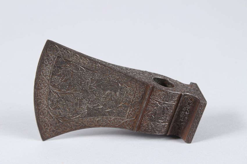 A PERSIAN METAL AXE HEAD decorated with animals and foliage.