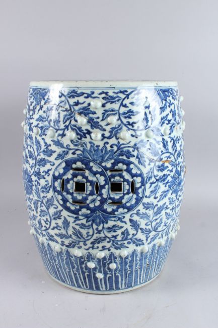 A LATE 19TH CENTURY CHINESE BLUE AND WHITE PORCELAIN BARREL SEAT, painted with an all over floral design (faults), 16in high.