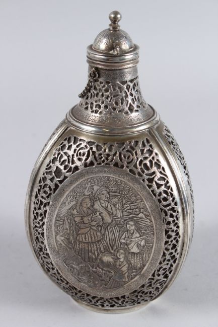 A VERY FINE EARLY 20TH CENTURY PERSIAN SILVER MOUNTED GLASS BOTTLE.