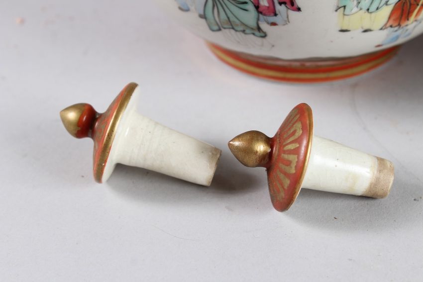 A PAIR OF 19TH/20TH CENTURY JAPANESE KUTANI PORCELAIN DOUBLE GOURD SHAPE VASES AND COVERS, painted with a band of figures, 13in high.