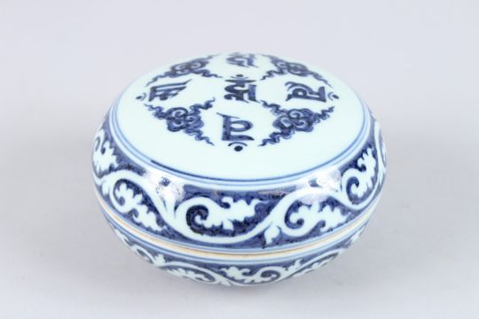A CHINESE BLUE AND WHITE CIRCULAR BOWL AND COVER with leaf scrolls.