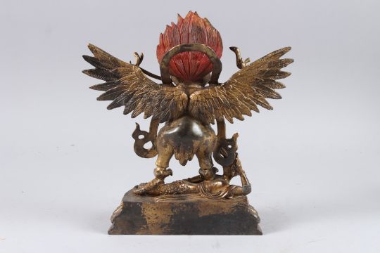 A TIBETAN GILT BRONZE STANDING BUDDHA, with arms outstretched, a snake in its mouth, 11in high.