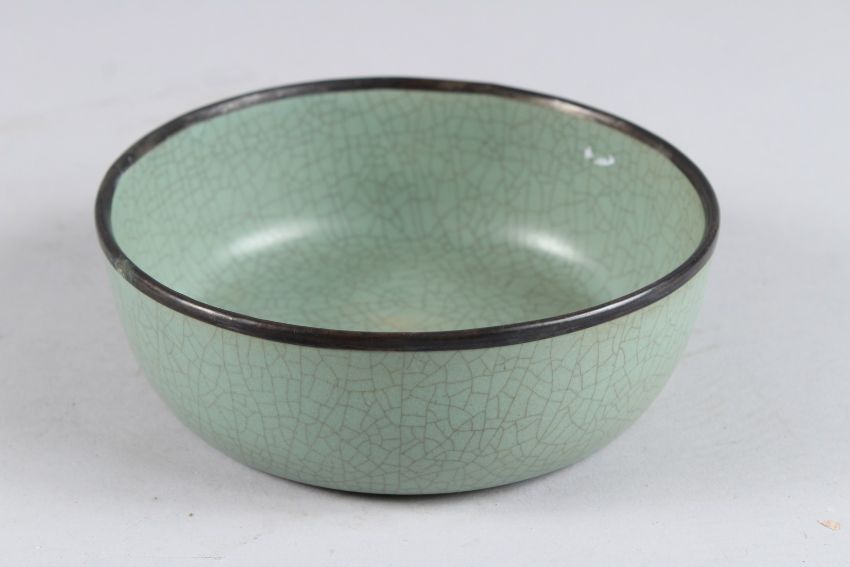 A CHINESE CELEDON GLAZED CIRCULAR BOWL calligraphy inscription to the base.
