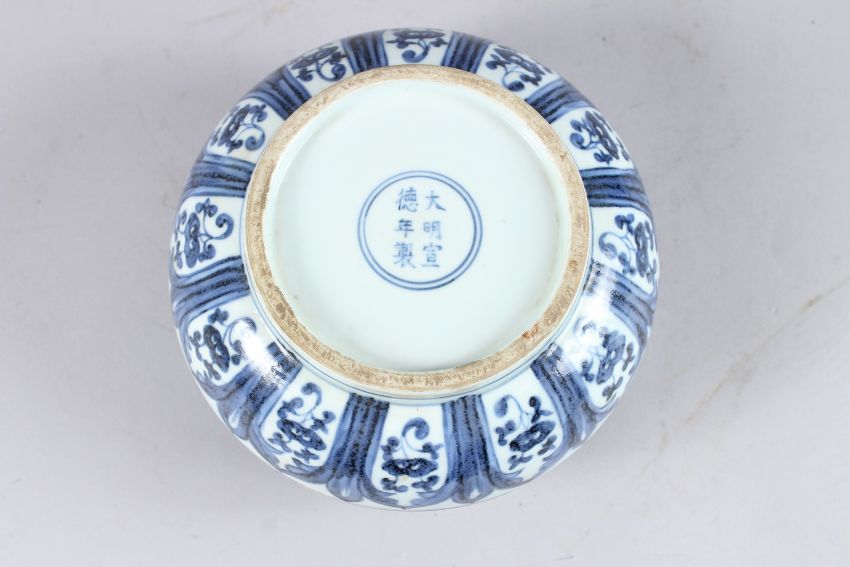 A CHINSES BLUE AND WHITE CIRCULAR BOX AND COVER, painted with 'yinyan' eight treasures, 7½in diameter.