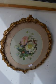 A pair of studies of flowers, watercolour, oval in decorative gilt frames.