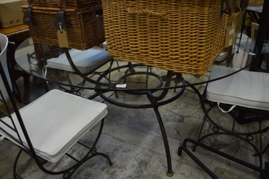A good wrought iron and glass circular table and set of six wrought iron chairs with cushions.
