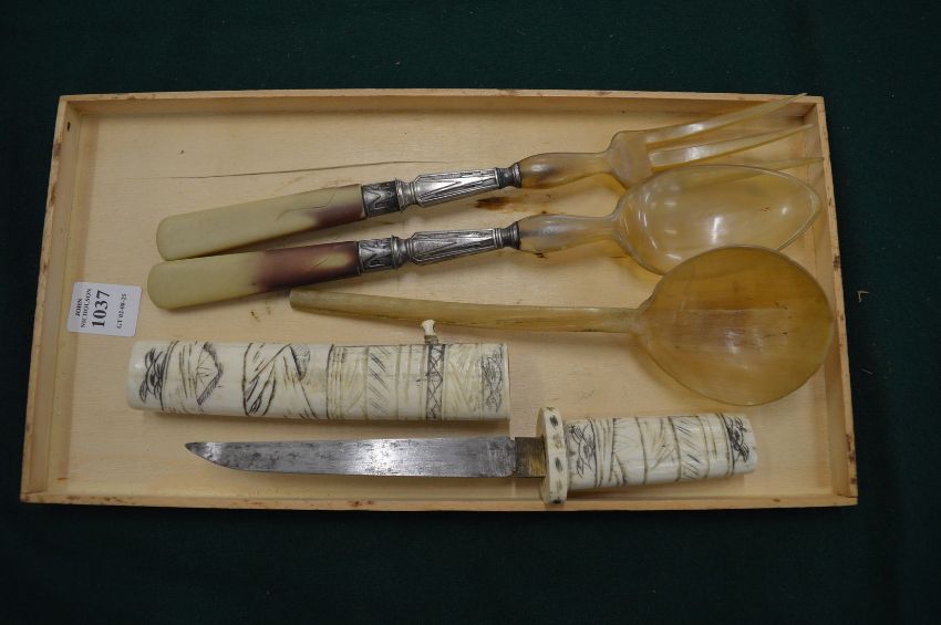 A bone mounted Japanese tanto and horn salad servers and another horn spoon.