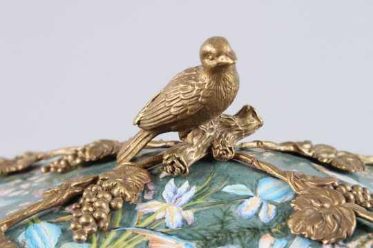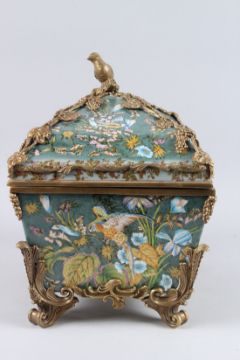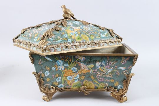 A LARGE PORCELAIN CASKET AND COVER with gilt metal fruiting vines and parrot handle.