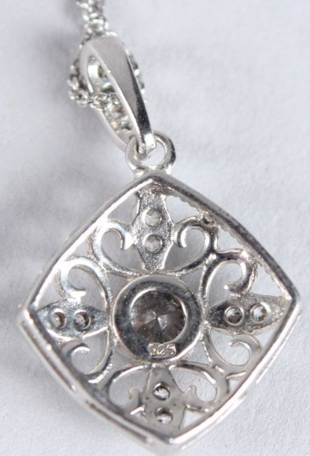AN ORNATE SQUARE SILVER PENDANT set with white cubic zirconia, on a silver chain.