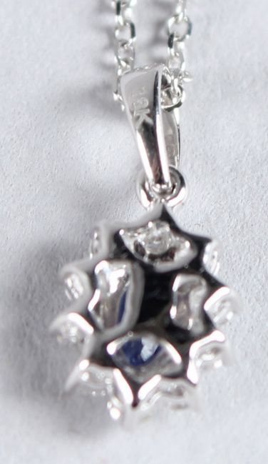 AN 18CT WHITE GOLD OVAL SAPPHIRE AND RBC DIAMOND CLUSTER NECKLACE, boxed.