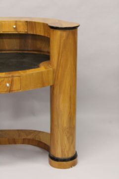 A VERY GOOD DECO DESIGN MAPLEWOOD OVAL SHAPED DESK fitted with three small drawers, leather writing surface and frieze drawer, on circular column support.