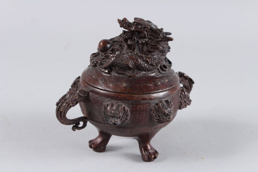 A CHINESE BRONZE CENSER with dragon lid and handles.
