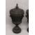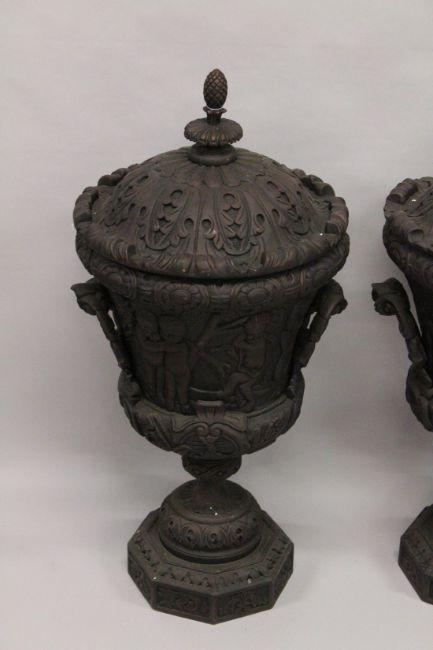 A LARGE PAIR OF WOODEN URNS AND COVERS.