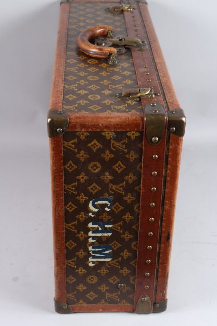 LOUIS VUITTON, A LARGE SUITCASE WITH MONOGRAMMED FABRIC AND LEATHER COVERING, brass locks and mounts, lift-out interior tray, labelled LOUIS VUITTON, PARIS, 70 CHAMPS ELYSEES, No. V50812.