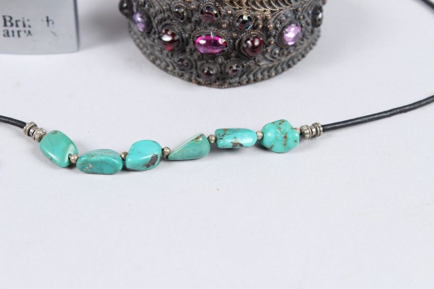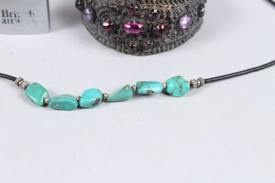 A BRASS INKWELL, BRACELET, LEAF AND NECKLACE, LIGHTER (5).