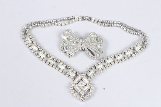 A GOOD DIAMANTE NECKLACE AND BOW BROOCH.