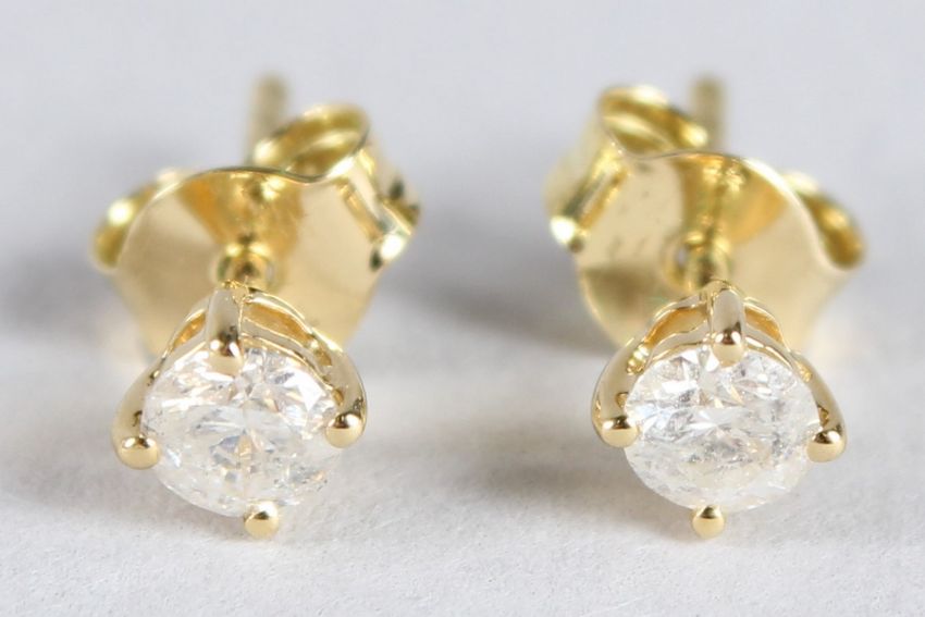 A PAIR OF 18CT YELLOW GOLD FOUR-CLAW SET RBC DIAMOND SOLITAIRE STUDS, boxed.