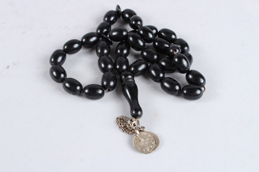 A BLACK BEAD NECKLACE with three silver coins.