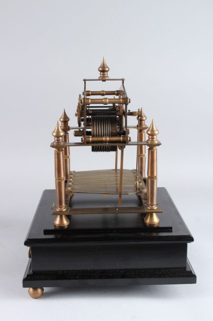 A REPRODUCTION BRASS 'CONGREVE' ROLLING BALL CLOCK, housed in a glass case.