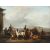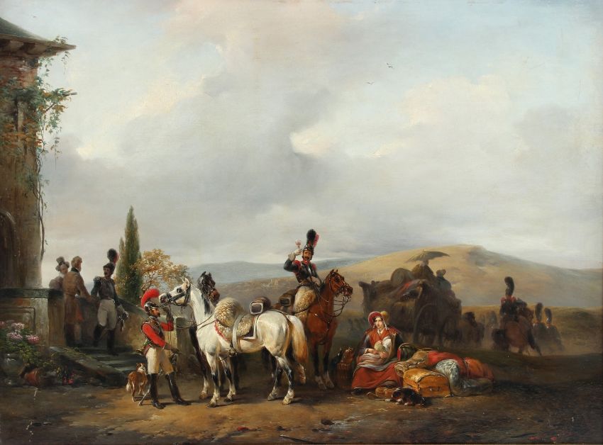 A scene at the entrance to a country house with a mounted cavalry officer raising a glass in a toast, troops departing and a woman and child seated amongst baggage,