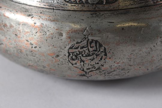 A 17TH CENTURY PERSIAN SAFAVID TINNED COPPER BOWL with calligraphic decoration.