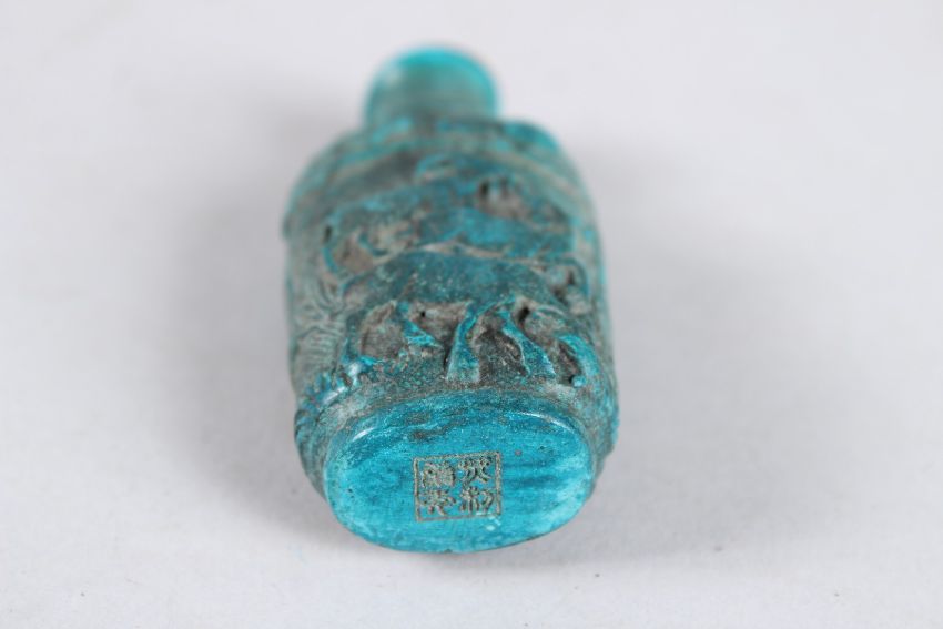 A CARVED TURQUOISE CHINESE SCENT BOTTLE AND STOPPER.