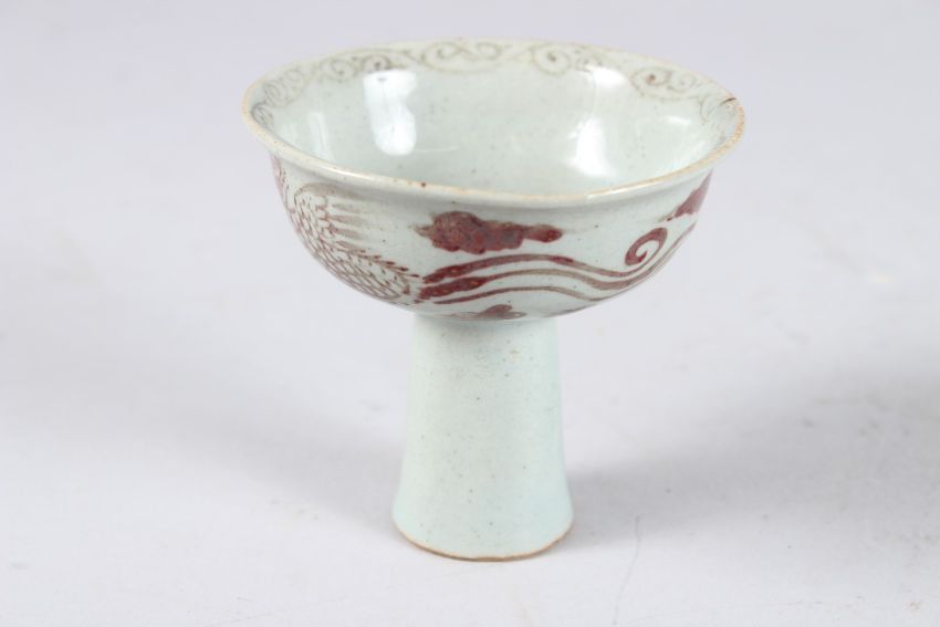 A CHINESE YUAN STLE UNDERGLAZED RED PHOENIX HIGH STAND CUP.