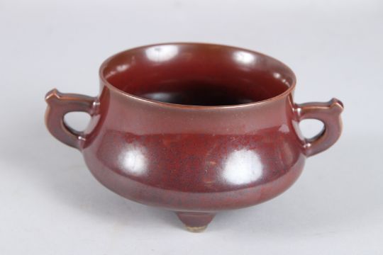 A CHINESE BOWN GLAZED TWO HANDLED CIRCULAR BOWL. Imperial mark.