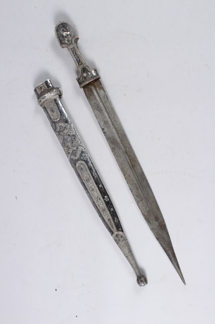A VERY FINE 19TH CENTURY CAUCASIAN NIELLO INLAID SILVER KINDJAL DAGGER.