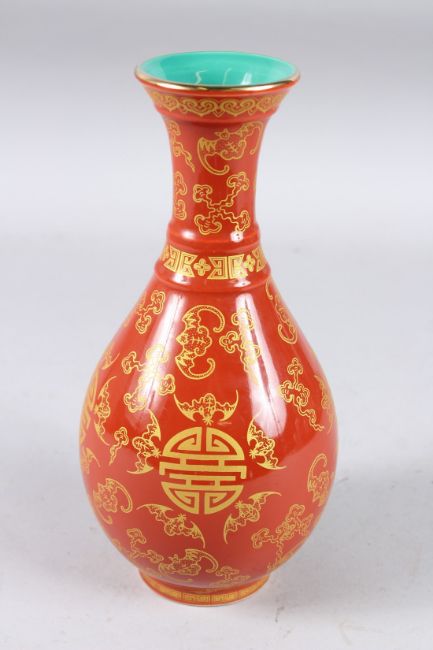 A CHINESE CORAL GROUND YUHUCHUN SHAPED VASE with filded Fu Shou symbols.