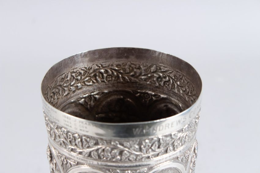 A VERY GOOD INDIAN WHITE METAL CHALICE with oval panels of figures.
