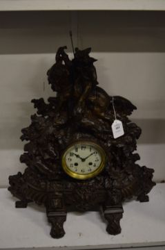A decorative cast metal mantel clock.
