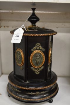 A Victorian black lacquer musical revolving cigar caddy with decorative mounts.