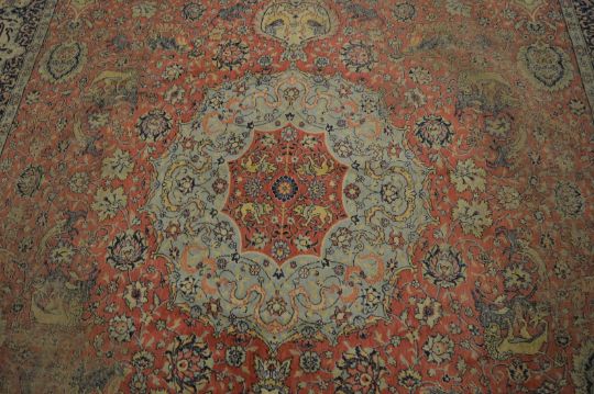 A large Persian style rug, pink ground decorated with animals, foliage and calligraphy, 400cm x 300cm (worn in places).