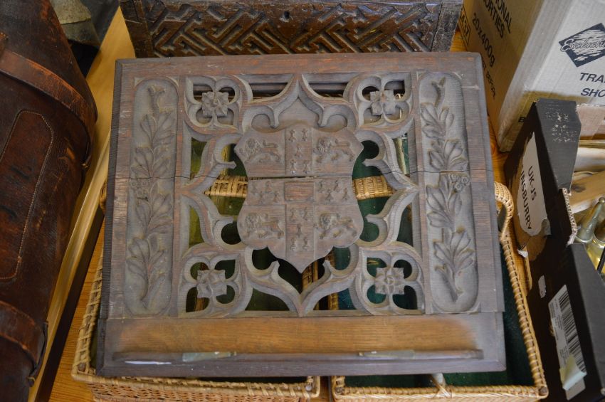 Two wicker cutlery baskets, a carved oak armorial style music stand and an early wooden box.