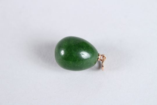 A 14CT GOLD RUSSIAN JADE AND DIAMOND CHICK PENDANT.