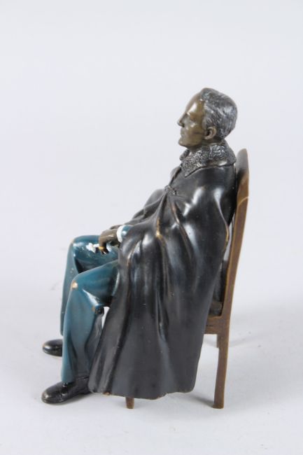 A BRONZE OF A MAN SEATED IN A CHAIR.