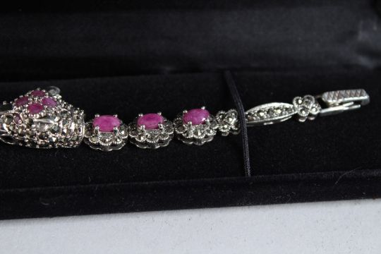 A SILVER RUBY SET AND MARCASITE DOUBLE PANTHER BRACELET.