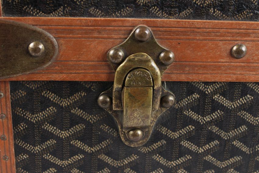 GOYARD, A LARGE SUITCASE WITH SIGNATURE PRINTED CANVAS COVERING, brass locks, leather mounts, lift-out interior tray.