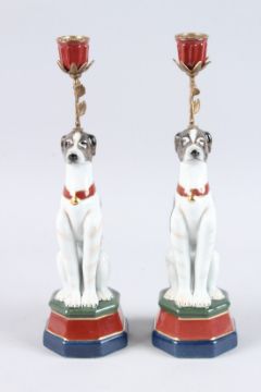 A PAIR OF SEVRES DESIGN PORCELAIN DOG CANDLESTICKS on hexagonal bases.
