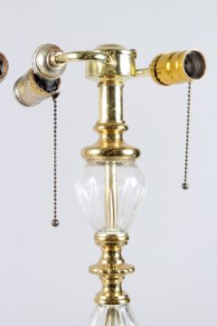 A PAIR OF GLASS AND BRASS LAMPS on circular bases.