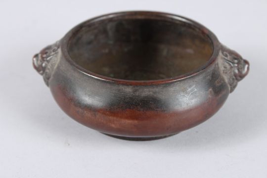 A CHINESE BRONZE CIRCULAR CENSER with foo dog handles.