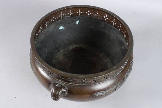 A GOOD LARGE CHINESE BRONZE CIRCULAR JARDINIERE with a pierced rim and elephant handles.