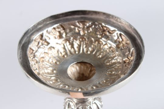 A VERY GOOD INDIAN WHITE METAL CHALICE with oval panels of figures.