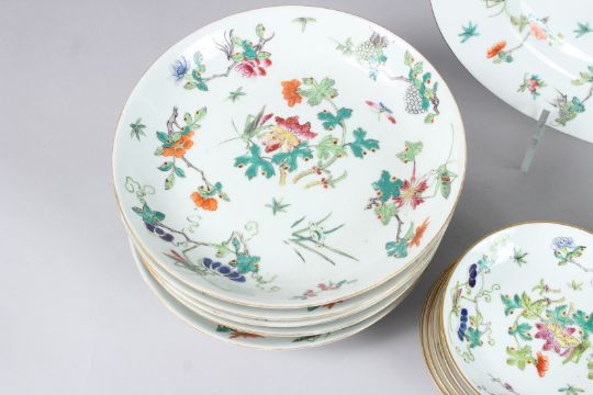 A CHINESE PART DINNER SERVICE painted with flowers and butterflies comprising twelve plates 9ins diameter, five small plates 6ins diameter, five saucers 5ins diameter, and a large oval dish 16ins wide.