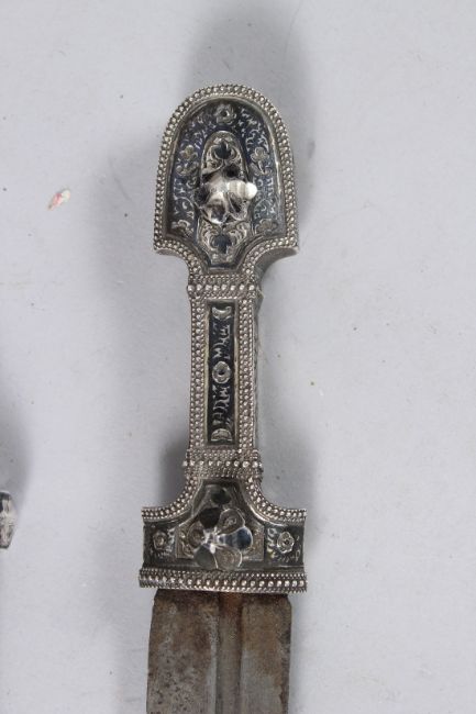 A VERY FINE 19TH CENTURY CAUCASIAN NIELLO INLAID SILVER KINDJAL DAGGER.