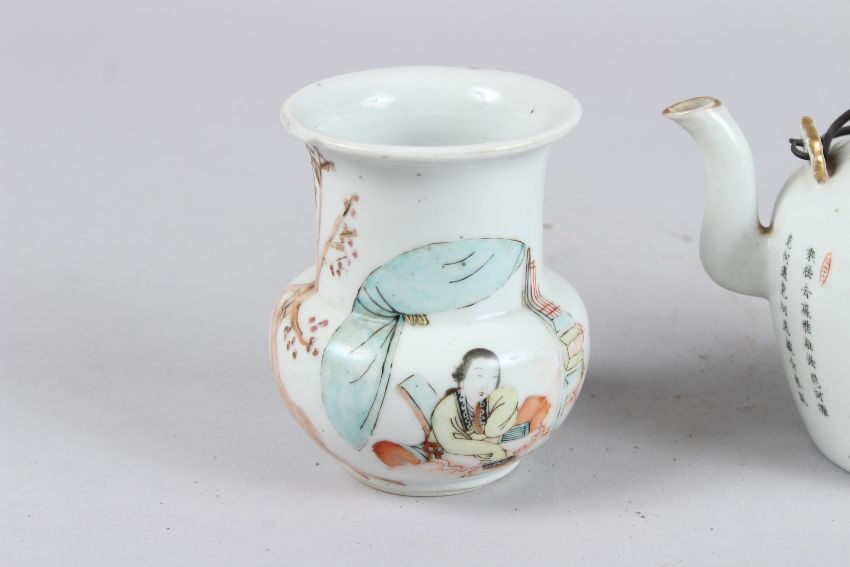 A CHINESE TEAPOT AND A VASE painted with figures and calligraphy.