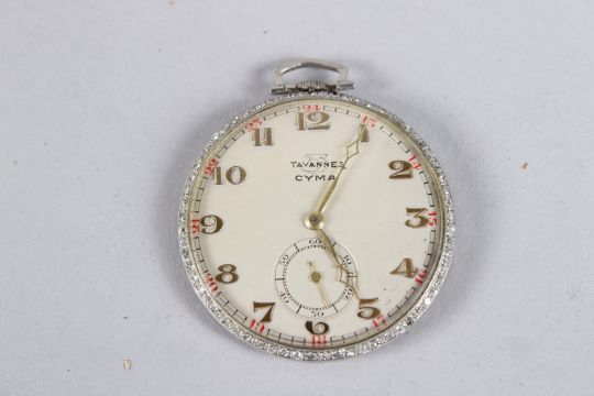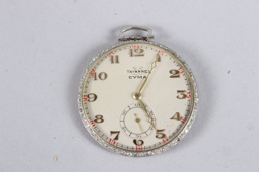 A GOOD TAVANNES CYMA PLATINUM AND DIAMOND POCKET WATCH.