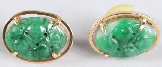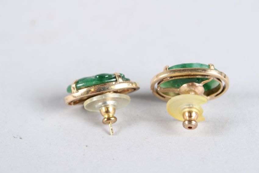 A PAIR OF GOLD AND CARVED JADE OVAL EARRINGS.
