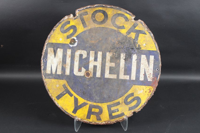 A VINTAGE DOUBLESIDED MICHELIN CIRCULAR ADVERTISING SIGN in blue and yellow. Michelin branding and the text IN STOCK MICHELIN TYRES.